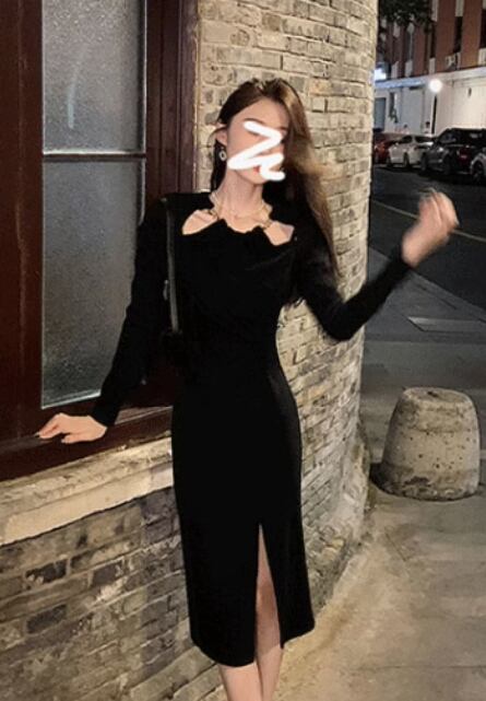 ドレス ミモレ 長袖 ラウンドネック タイト スリム 細身 ストレート スリット ハイウエスト かわいい 大人可愛い きれいめ シンプル 上品 おしゃれ かっこいい レトロ ガーリー クール エレガント モダン セクシー 無地 春 秋 二次会 レディース 女性用 女の子 10代 20代 デート お出かけ パーティー イベント リゾート 旅行 レストラン 女子会 休日 バカンス ホテル ガーデン ショッピング 発表会 コンサート 合コン コンパ カフェ 婚活 ディナー 普段使い S M L XL ブラック