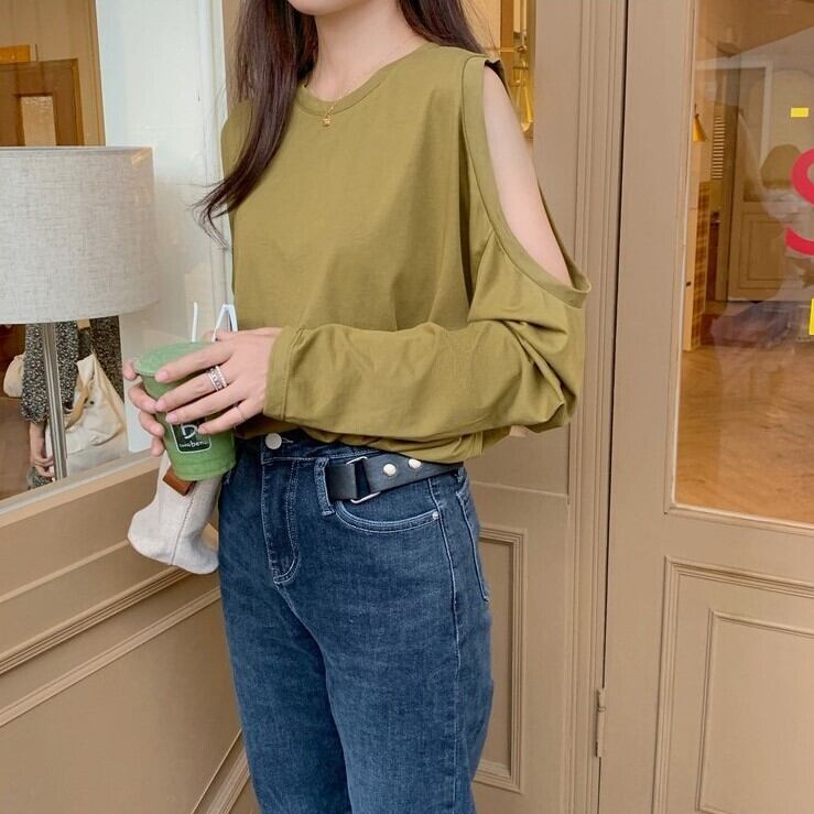 肩出し 肌見せ レディース トップス Tシャツ カットソー ミディアム丈 長袖 萌袖 オープンショルダー クルーネック 襟なし かわいい 大人可愛い きれいめ シンプル カジュアル おしゃれ かっこいい こなれ感 抜け感 無地 春 秋 ママ 女の子 学生 学校 通学 デート お出かけ 女子会 休日 ショッピング ライブ カフェ 重ね着 韓国 オルチャン コーデ 体型カバー 普段使い デイリー 着回し レイヤード 合わせやすい L XL ゆったり 白 ホワイト 黒 ブラック 緑 オリーブグリーン カラバリ