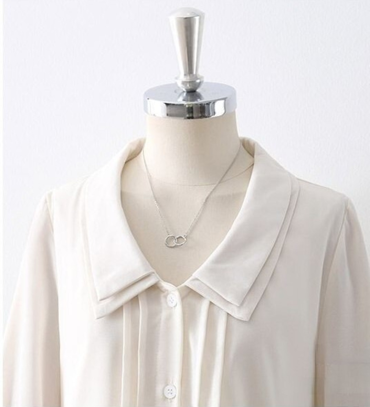 二重衿のデザインがさりげなくおしゃれなピンタックブラウス。すっきりVネックの襟付きデザインなのでネックレス等首元のおしゃれが映え、小顔効果も期待できます。