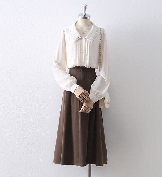 レトロ感のあるシンプルで上品なデザインなので合わせるボトム次第できちんと感のあるきれいめスタイル~大人可愛いカジュアルめコーデまで幅広く着回し自在。落ち感のある薄手の軽やかな生地でもたつきにくく、ボトムへの裾インもしやすいアイテムです。