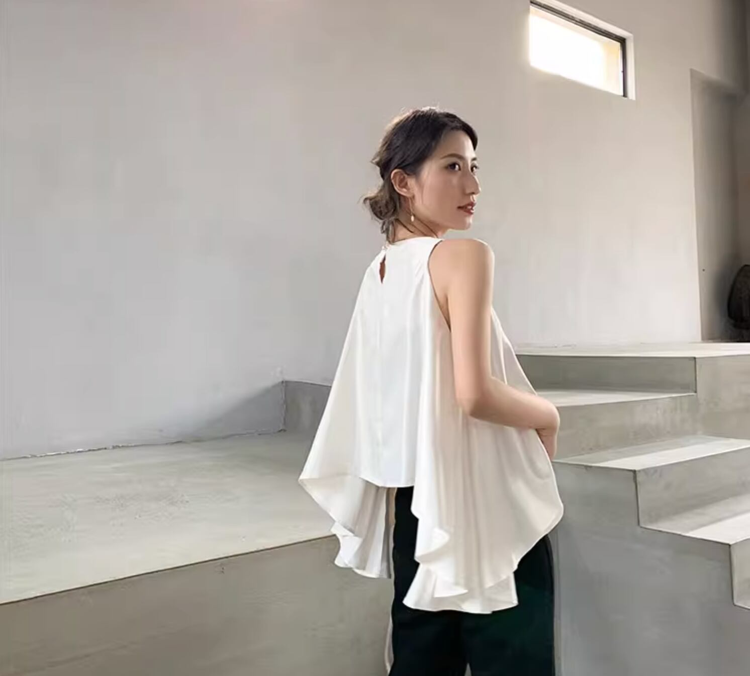 変形トップス レディース ブラウス 袖なし ノースリーブ ラウンドネック アシンメトリー ドレープ かわいい 大人可愛い きれいめ カジュアル 上品 おしゃれ こなれ感 ルーズ クール エレガント フォーマル とろみ感 無地 夏 結婚式 二次会 披露宴 お呼ばれ ママ オフィス ビジネス OL 通勤 デート お出かけ お泊まり パーティー イベント リゾート 旅行 休日 バカンス ホテル 重ね着 韓国 オルチャン コーデ 普段使い 着回し レイヤード S M L ホワイト