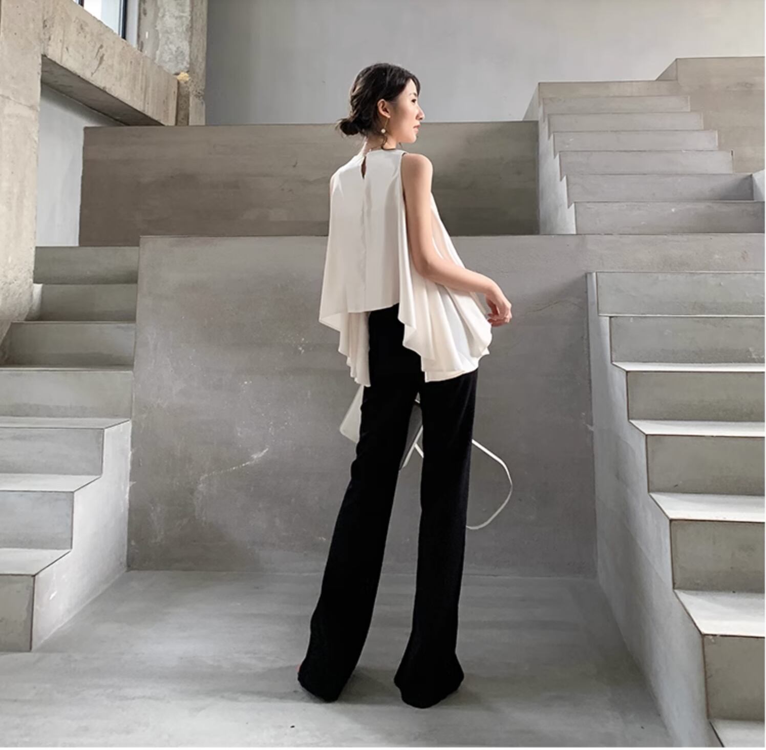 ノースリーブの変形トップスです。ラウンドネックとドレープが施されたアシンメトリーデザインが、女性らしい華やかさを引き立てます。コーディネート次第でカジュアルにも上品にも着こなせるので、幅広いスタイルに対応します。