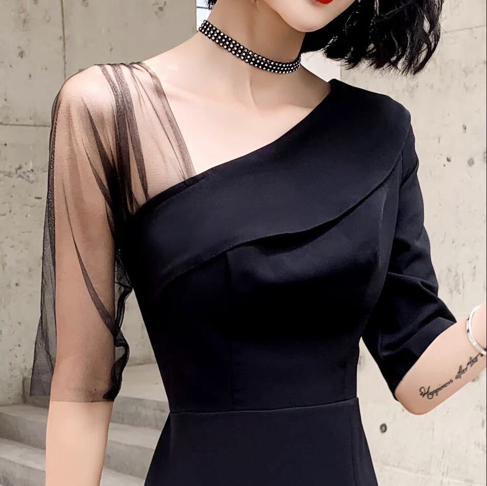 深いスリットがセクシーな大人のパーティードレスです。オフショルダー風のデザインがおしゃれで、アシンメトリーデザインのシースルーの袖が抜け感と洗練された印象の個性的な一枚です。4カラー展開で、季節やイメージに合わせてお選びいただけます。