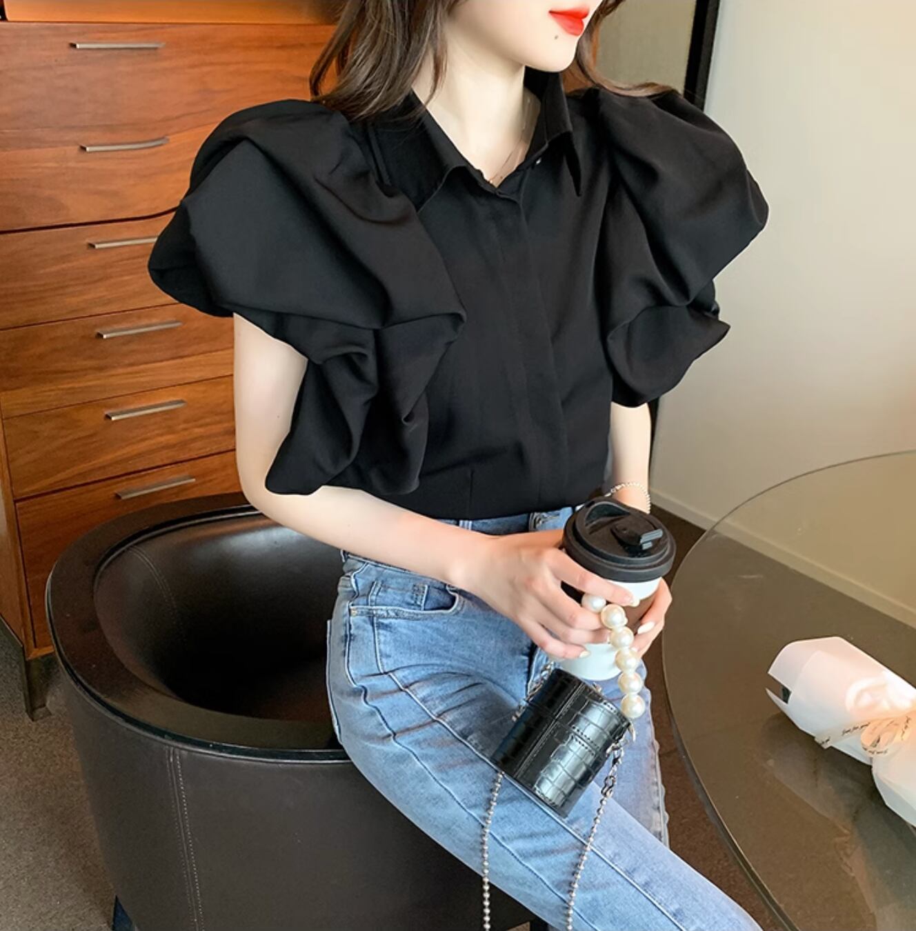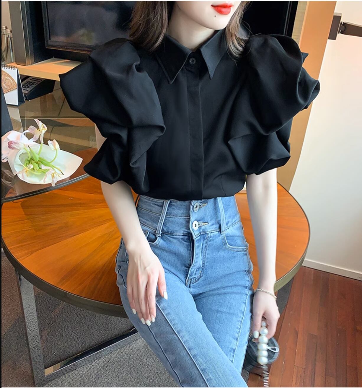 レディース トップス シャツ ブラウス 半袖 ボリューム袖 パフスリーブ 襟付き ボタン かわいい 大人可愛い きれいめ シンプル カジュアル 上品 おしゃれ レトロ こなれ感 ガーリー 個性的 エレガント 主役級 存在感 ラブリー キュート 夏 デート お出かけ お泊まり パーティー イベント リゾート 旅行 海 プール ビーチ 女子会 休日 バカンス ショッピング 韓国 オルチャン コーデ 体型カバー 普段使い 着回し 二の腕カバー S M L XL 2XL ホワイト 黒