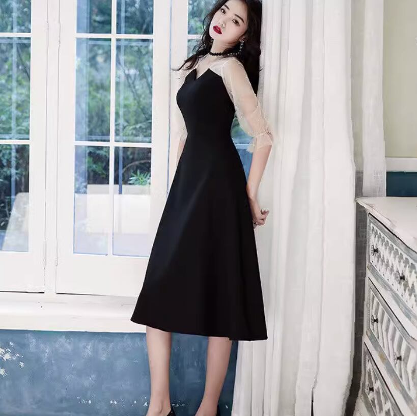 ドレス ワンピース ウェディング パーティー 結婚式 二次会 披露宴 演奏会 発表会 ステージ フォーマル 衣装 ミモレ 5分袖 パフスリーブ Vネック 襟なし Aライン 切り替えデザイン 透け感 シースルー 可愛い きれいめ シンプル 大人可愛い 上品 おしゃれ かっこいい レトロ エキゾチック キュート クール モード エレガント モダン 主役級 存在感 クラシック 清楚 ゴージャス エレガント シック 華やか ナチュラル クラシカル 二の腕カバー 高見え 春 夏 2XL S M L XL ブラック