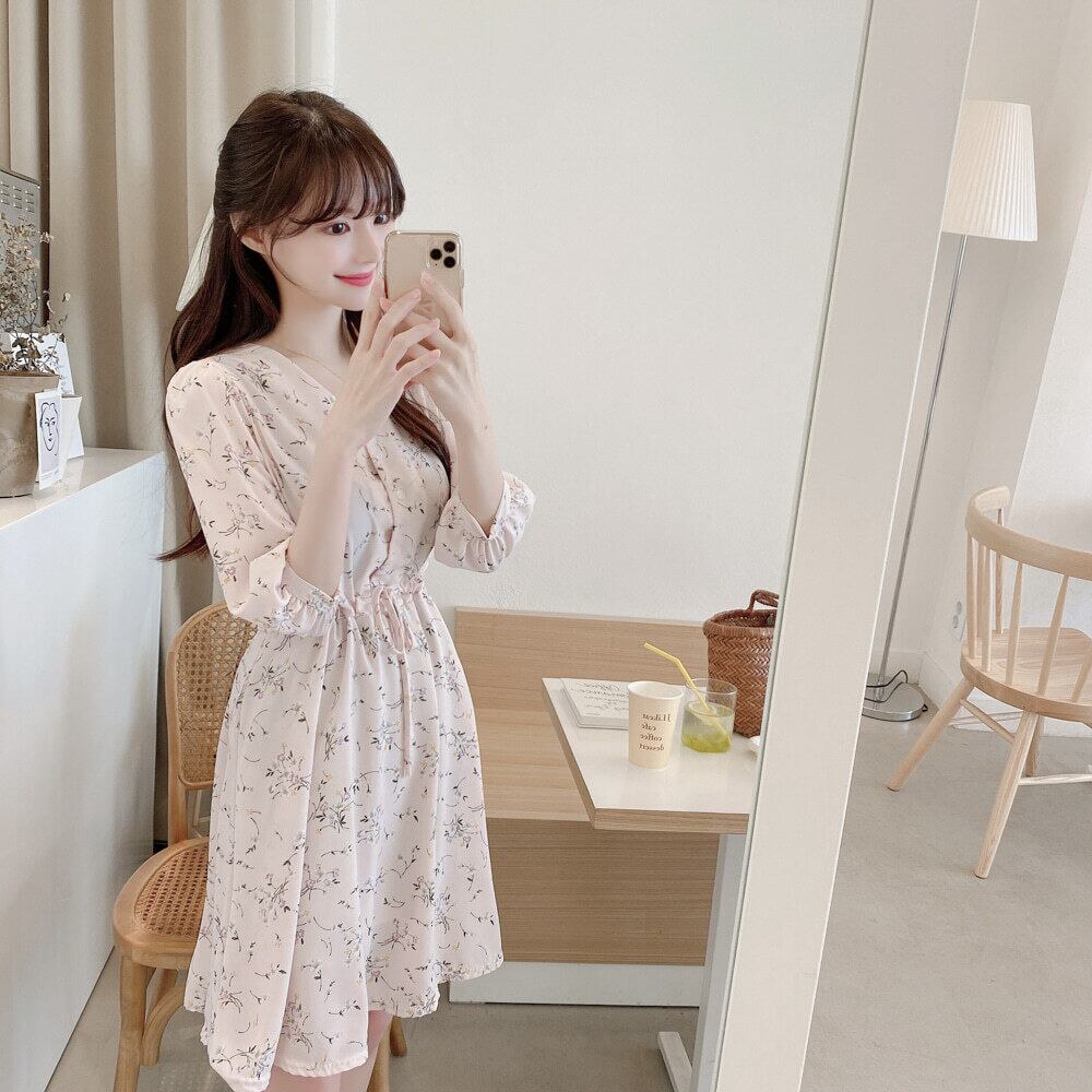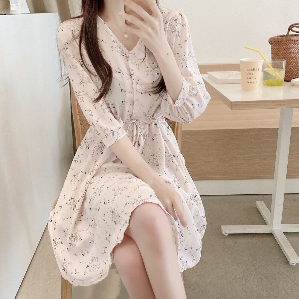 フローラルプリント レディース ワンピース 膝丈 膝上 ミディアム丈 7分袖 ボリューム袖 パフスリーブ Vネック 襟なし セミフレア Aライン ウエストマーク ハイウエスト ドロスト フロントボタン かわいい 大人可愛い きれいめ シンプル カジュアル 上品 おしゃれ フェミニン 清楚 花柄 フラワー 総柄 春 夏 ママ 女の子 OL 通勤 学生 学校 通学 デート お出かけ 休日 カフェ 重ね着 韓国 オルチャン コーデ 体型カバー 普段使い 着回し 清楚 S M L XL ゆったり オフホワイト