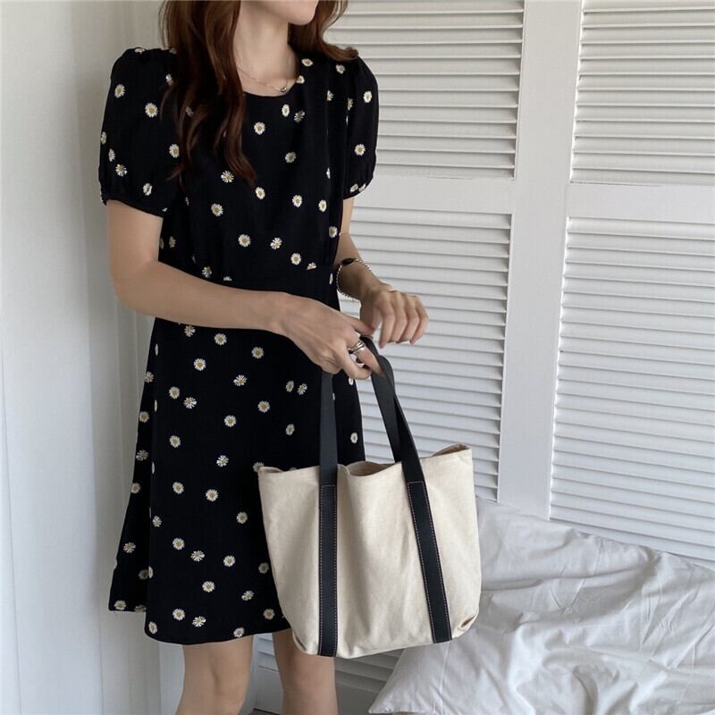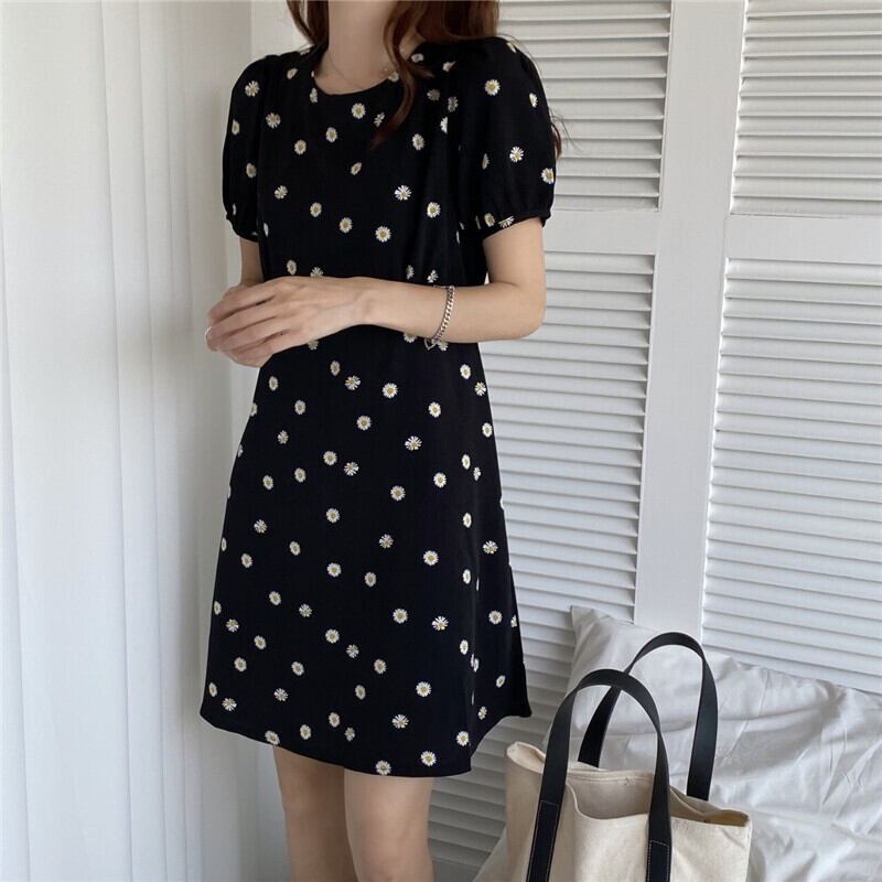 デイジー柄 レディース ワンピース 膝上 ミニ丈 ミディアム丈 半袖 ボリューム袖 パフスリーブ ラウンドネック 襟なし Aライン 切り替え ウエストリボン バックリボン かわいい 大人可愛い きれいめ シンプル カジュアル 上品 おしゃれ レトロ こなれ感 ガーリー キュート フェミニン 花柄 フラワー 総柄 春 夏 女の子 学生 学校 通学 デート お出かけ 旅行 休日 ショッピング カフェ 重ね着 韓国 オルチャン コーデ 脚長 普段使い 着回し 清楚 S M L XL 黒 ブラック モノトーン