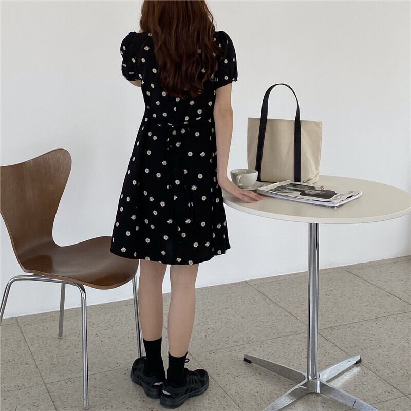 黒地に白のデイジー柄が映える半袖ワンピース。膝上ミニ~ミディアム丈のAラインで、パフスリーブやバックウエストリボンデザインなど、可愛らしさを引き立てるデザインも魅力的です。