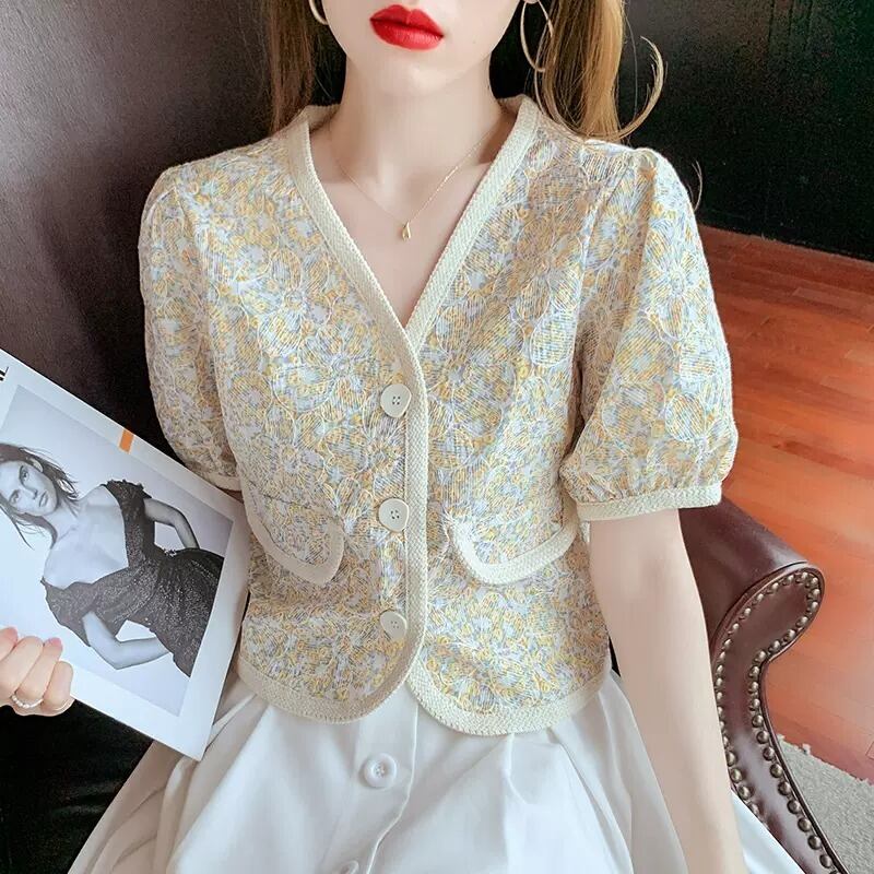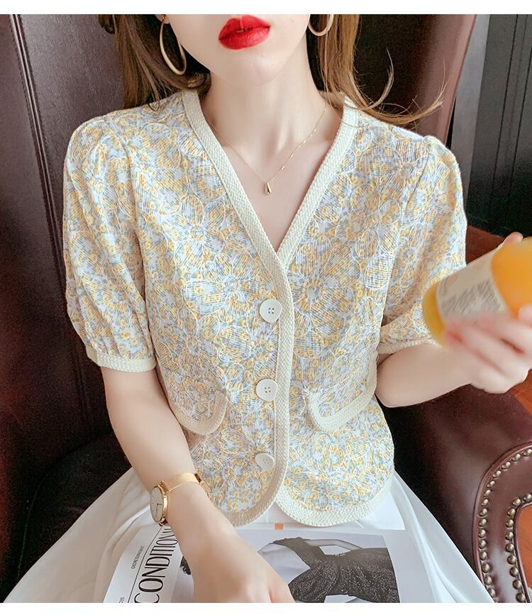 レディース トップス ジャケット シャツ カーディガン アウター 上着 羽織 半袖 パフスリーブ Vネック 襟なし フェミニン 2way かわいい 大人可愛い きれいめ 上品 おしゃれ ガーリー ラブリー キュート 花柄 フラワー 春 夏 デート お出かけ 女子会 休日 合コン コンパ 婚活 重ね着 コーデ モテ 清楚 S M L XL イエロー