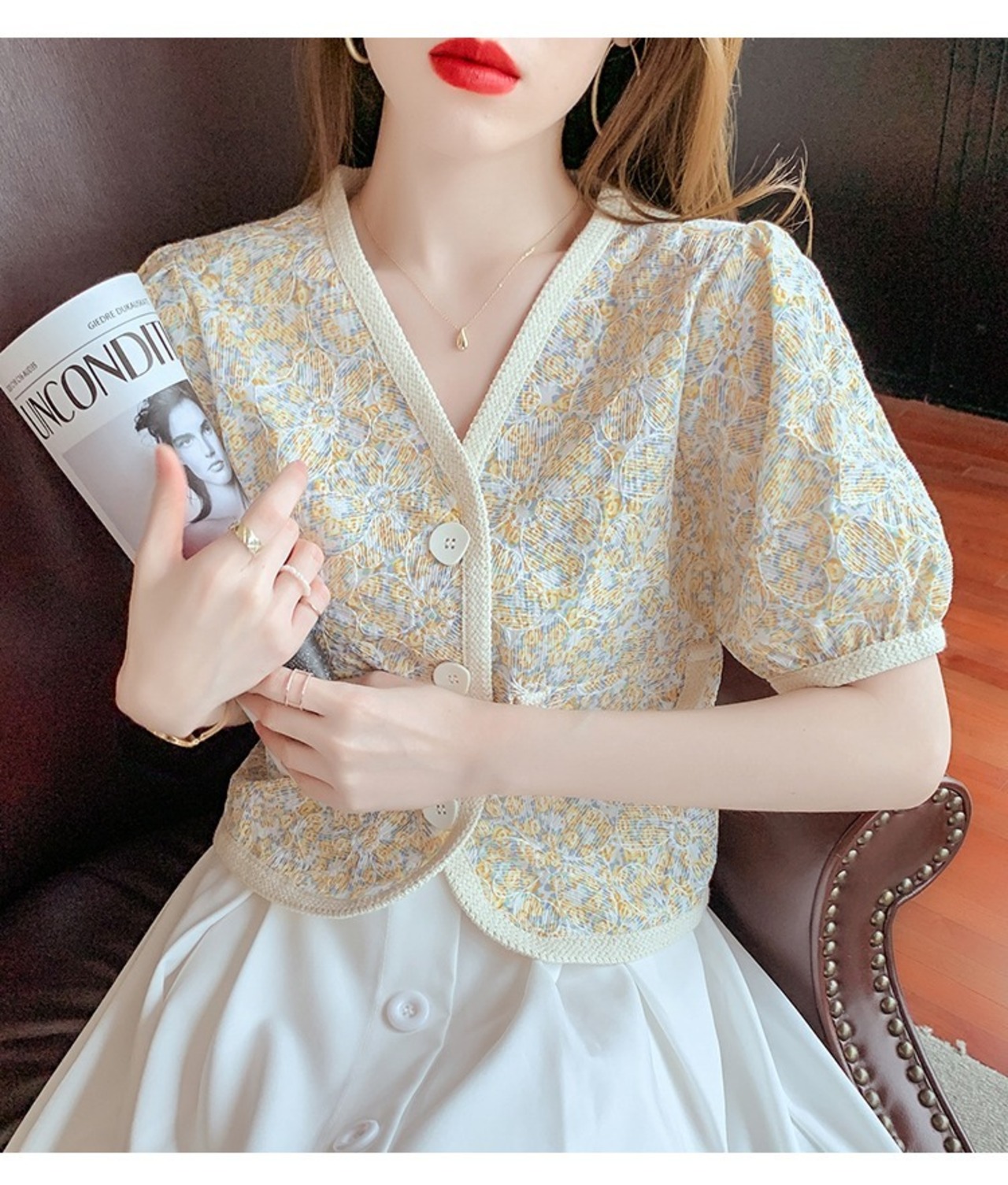 このトップスは、パフスリーブや花柄など、女性らしい要素が際立つデザインが特徴です。Vネックでデコルテをきれいに見せてくれるので、女性らしさを引き立ててくれます。