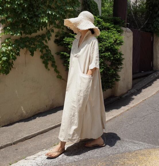 リネン素材のフレアワンピース。