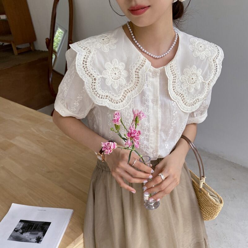 レディース トップス シャツ ブラウス 前開き 半袖 パフスリーブ Uネック 襟付き ビッグカラー フェミニン 刺繍 シフォン 透け感 薄手 かわいい 大人可愛い きれいめ 上品 おしゃれ レトロ ガーリー 花柄 フラワー 春 夏 オフィス ビジネス OL 通勤 デート お出かけ 女子会 合コン コンパ 婚活 重ね着 コーデ 着回し モテ 清楚 流行 S M L XL 白 ホワイト