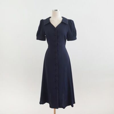 このワンピースは、ウエストのタックとハイウエストのデザインが、きれいなシルエットを作り出します。フレアの広がりとウエストのマークが女性らしい曲線美を演出し、抜群の存在感を放ちます。前開きデザインがラフな印象を与えながらも、上品さをキープしてくれます。