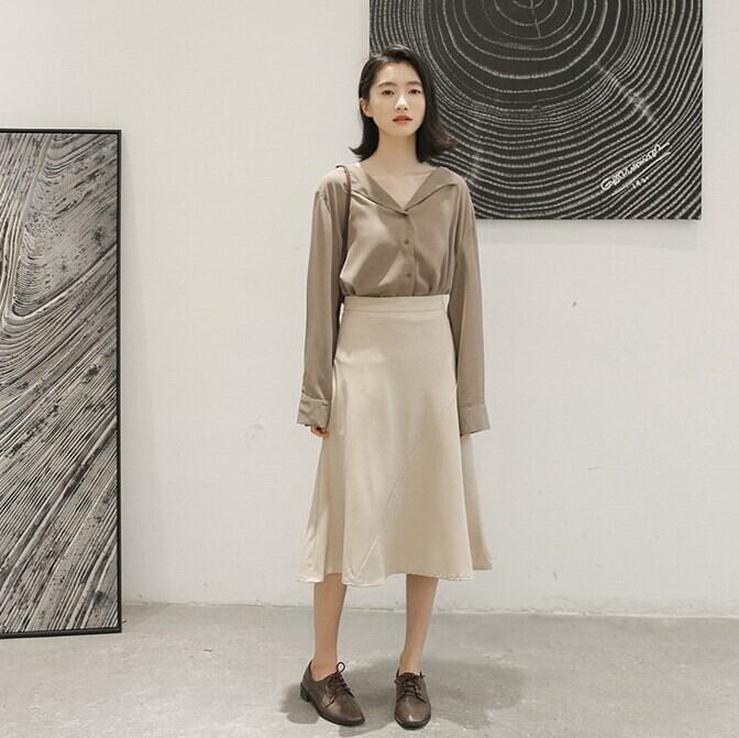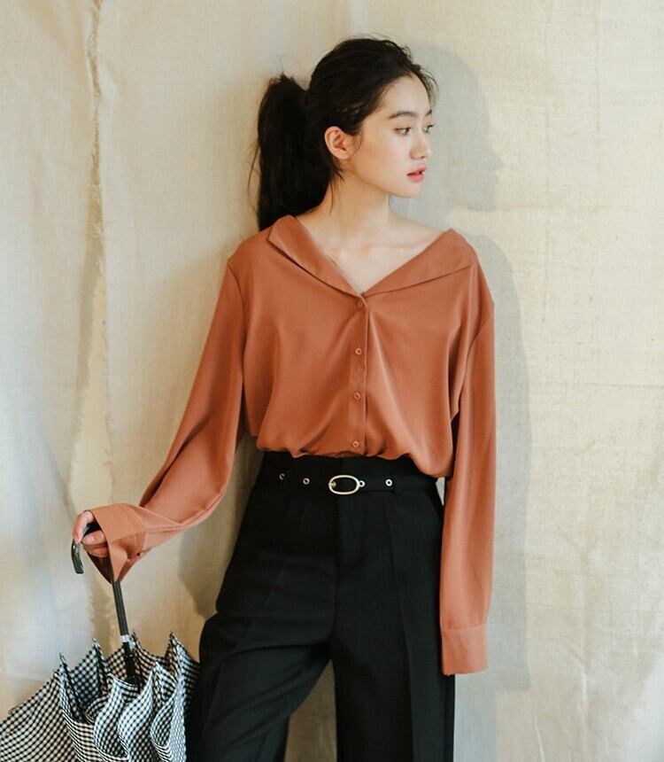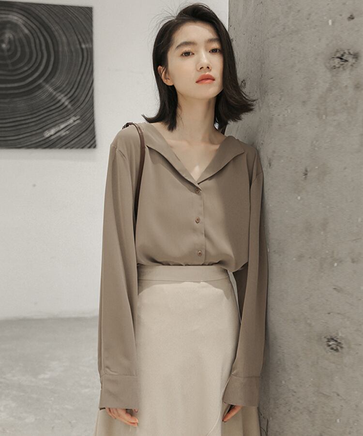 身頃と襟が一続きに見えるオブロングカラーがおしゃれなオーバーサイズブラウス。デコルテや鎖骨を美しく見せてくれるデザインで、長めの袖丈も女性らしい雰囲気です。