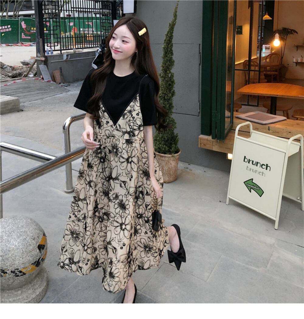 無地のTシャツと花柄のジャンパースカートのセットです。ミモレ丈のデザインが大人の女性らしく、エレガントな雰囲気を演出します。さらに、ゆったりとしたAラインのシルエットで、自然な体型カバーが叶います。このセットだけで簡単にコーデがキマるので、普段使いにも最適です。お洒落な大人女子にぴったりのアイテムですので、ぜひお手元にお迎えください。