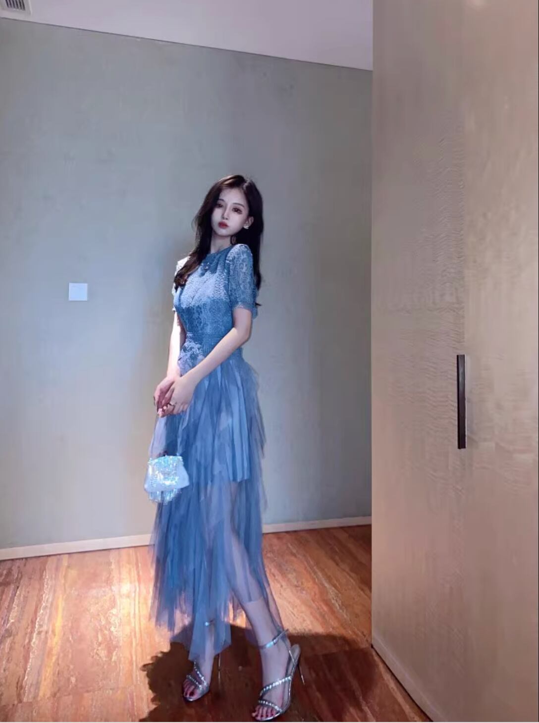 パーティードレス レディース ロング 半袖 切り替え フェミニン ボリューム レース チュール 透け感 シースルー 異素材ミックス かわいい 大人可愛い きれいめ シンプル カジュアル 上品 おしゃれ レトロ こなれ感 ガーリー エレガント 主役級 存在感 フレンチ セクシー 結婚式 二次会 披露宴 デート お出かけ パーティー イベント レストラン 休日 ホテル 発表会 コンサート ステージ 舞台 お呼ばれ セレモニー 体型カバー インスタ映え S M L ブルー アプリコット