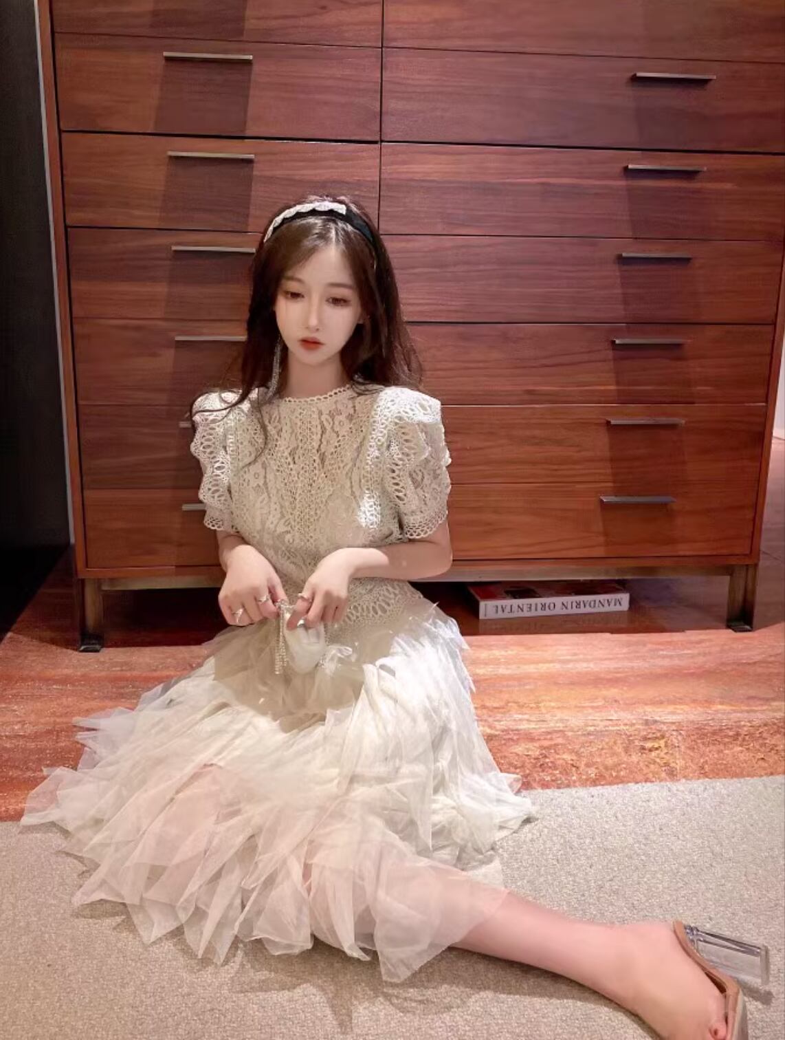 霧のような透け感が魅力のパーティードレスです。透け感のあるレースとチュールの異素材ミックスがエレガントさを演出します。ボリュームのあるスカートが華やかさを加え、パーティーやイベントで存在感を発揮する一着です。