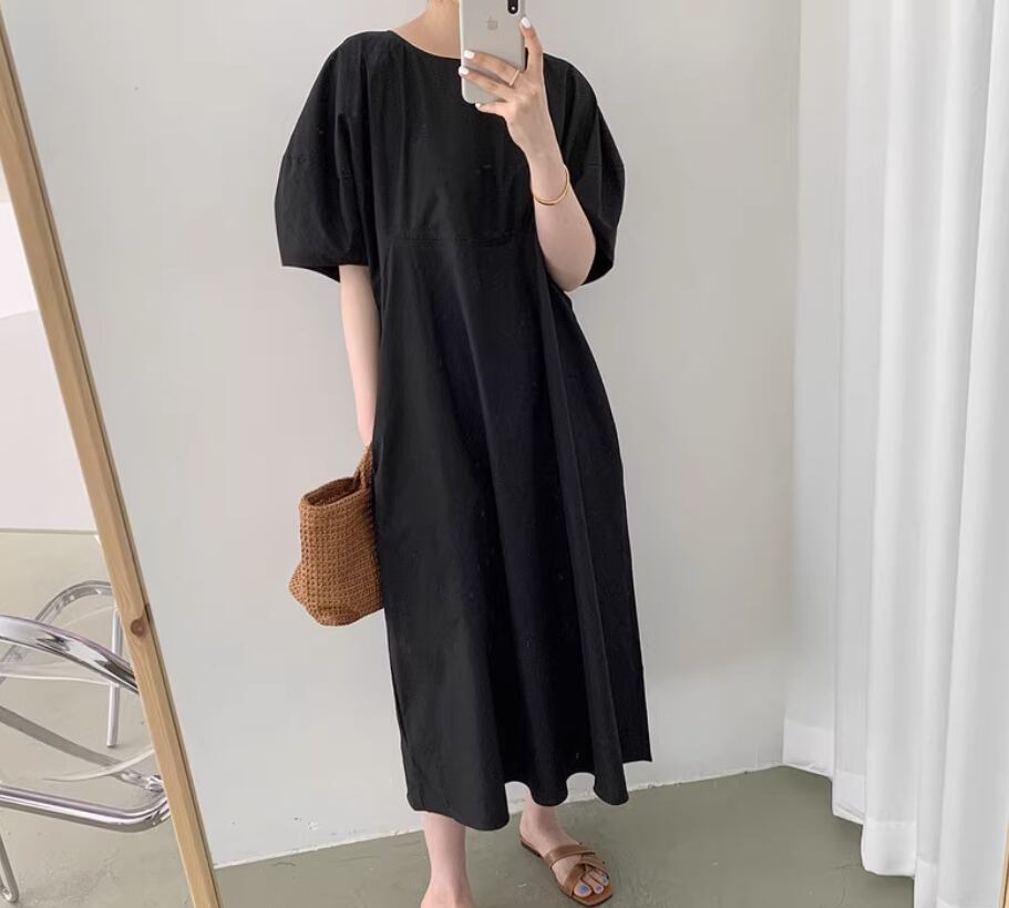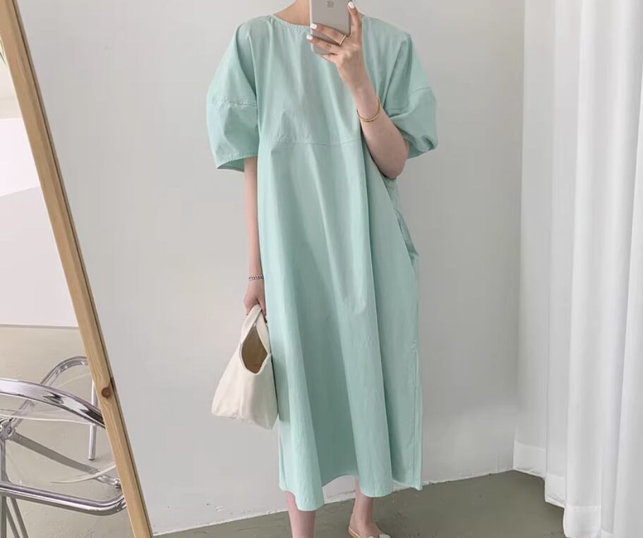 レディース スカート ワンピース ロングスカート ロング 5分袖 ボリューム袖 パフスリーブ 襟なし ノーカラー Aライン オーバーサイズ フェミニン 薄手 かわいい 大人可愛い きれいめ シンプル カジュアル 上品 おしゃれ かっこいい レトロ こなれ感 ラフ ルーズ 個性的 クール 主役級 存在感 とろみ感 抜け感 キュート ナチュラル 無地 春 夏 リゾート 女子会 休日 バカンス カフェ コーデ 楽ちん 体型カバー 普段使い モテ ゆったり ゆる フリーサイズ ブラック アプリコット グリーン