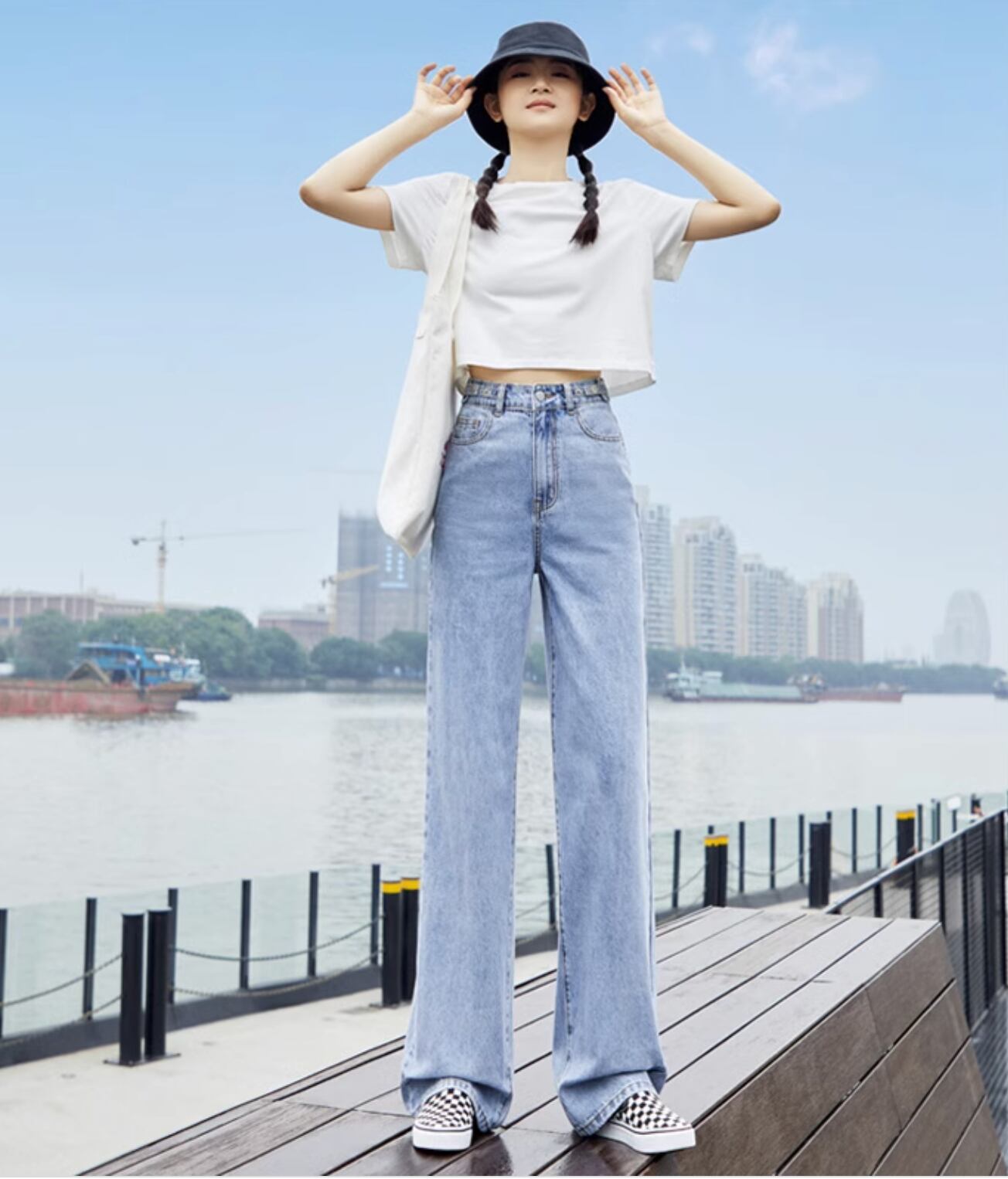 ハイウエストデザインのワイドレッグジーンズです。調節可能なウエストデザインで、楽ちんな着心地と着回しのしやすさも魅力です。タイトなトップスとの相性抜群です。
