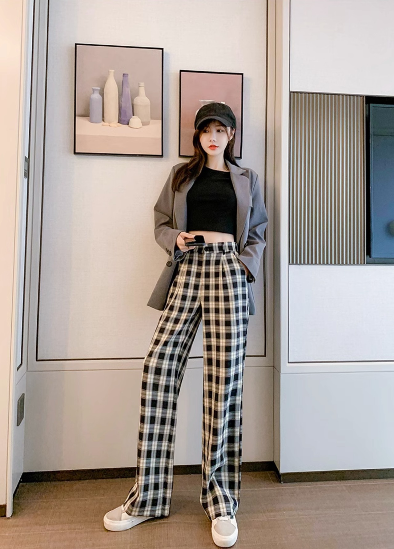 チェック柄が可愛いハイウエストストレートパンツです。薄手の素材で軽やかな履き心地で、ウエスト部分はゴム仕様なので締め付け感もなく快適です。シンプルなデザインなのでオフィスやビジネスシーンにもピッタリです。