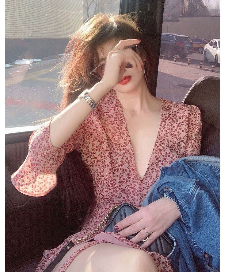 透け感のある軽やかな素材感が魅力のフラワープリントワンピース。膝下のミモレ丈~ロング丈で裾のフリル切り替えが雰囲気のあるシルエットを作り出します。深めのカシュクールVネックが女らしくセクシーな雰囲気。開きが気になる方は見せOKなキャミソール等インナーとのレイヤードがおすすめです。