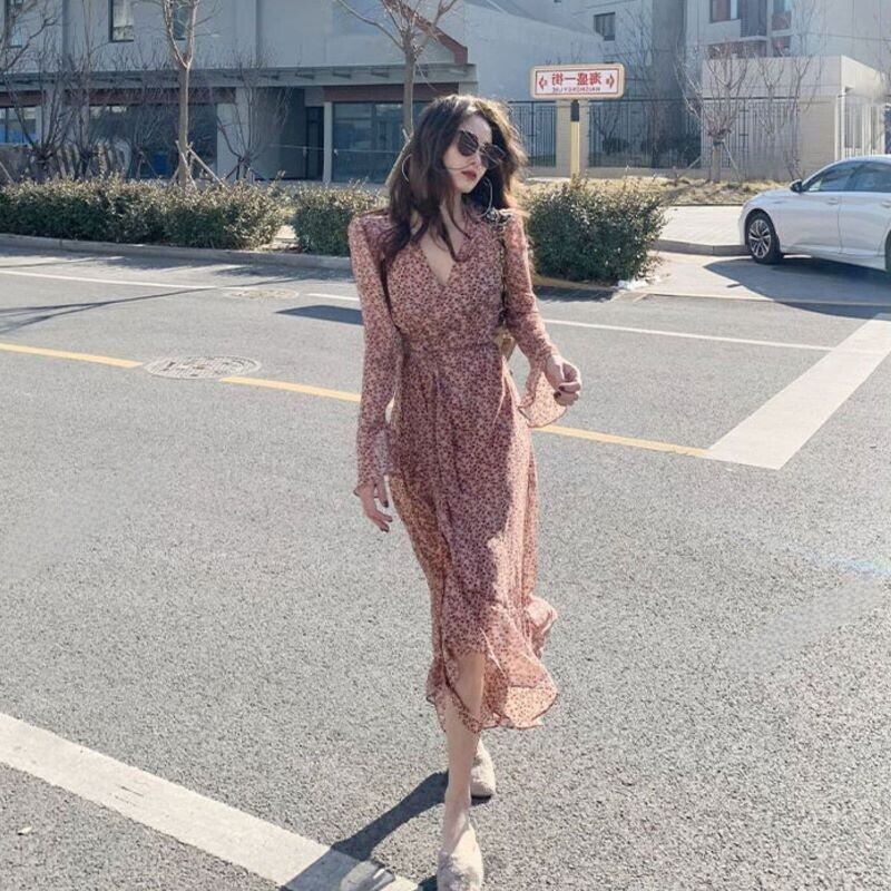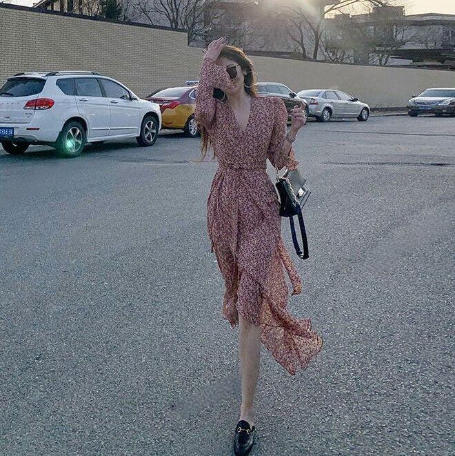 裾フリル レディース ワンピース 膝下 ミモレ ロング 長袖 フレアカフス Vネック カシュクール 襟なし Aライン シフォン ウエストマーク ウエストリボン ハイウエスト 透け感 シースルー 切り替えデザイン シアー かわいい 大人可愛い きれいめ シンプル カジュアル 上品 おしゃれ フェミニン セクシー 女っぽ 軽やか 花柄 フラワー 春 秋 ママ 女の子 学生 学校 通学 デート お出かけ リゾート 旅行 休日 バカンス 韓国 オルチャン コーデ 体型カバー 脚長 S M L XL 大人カラー