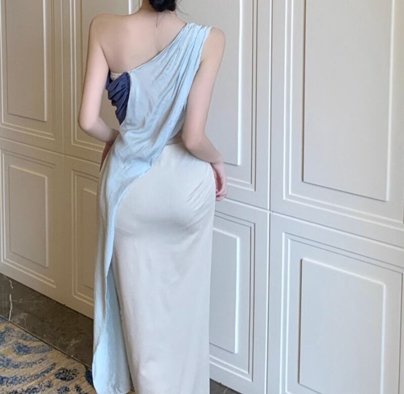 ドレス ワンピース パーティー 演奏会 発表会 ステージ 舞台 キャバ 衣装 ラウンジ クラブ ミモレ ロング 袖なし ノースリーブ ワンショル 襟なし スレンダー タイト スリム ストレート 細身 レース 切り替えデザイン ドッキング 薄手 きれいめ 大人可愛い 上品 おしゃれ かっこいい レトロ アジアン エキゾチック クール モード エレガント モダン 主役級 存在感 とろみ感 クラシック 清楚 ゴージャス エレガント セクシー シック 華やか クラシカル 脚長 高見え 夏 S M L ライトブルー