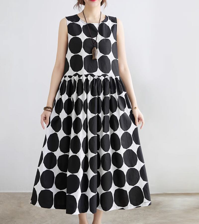 ワンピース モテアイテム デート ロングワンピース ドレス 膝下 ノースリーブ ドット柄 水玉 フレア Aライン ウエストマーク バックリボン コットン かわいい 大人可愛い きれいめ シンプル カジュアル 上品 おしゃれ こなれ感 ラフ ガーリー ルーズ エレガント モダン 主役級 ナチュラル 無地 オフィス ビジネス OL 通勤 学生 通学 デート お出かけ リゾート 旅行 女子会 休日 バカンス モノトーン 重ね着 お揃い 韓国 オルチャン コーデ 楽ちん 美脚 脚長 定番 M L XL 2XL