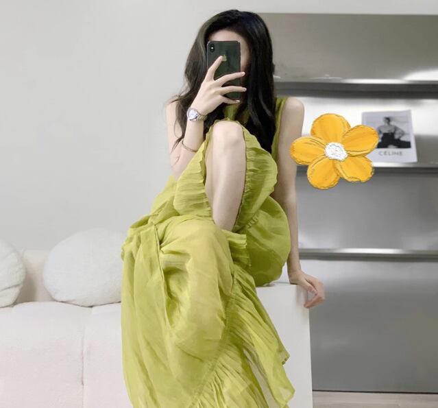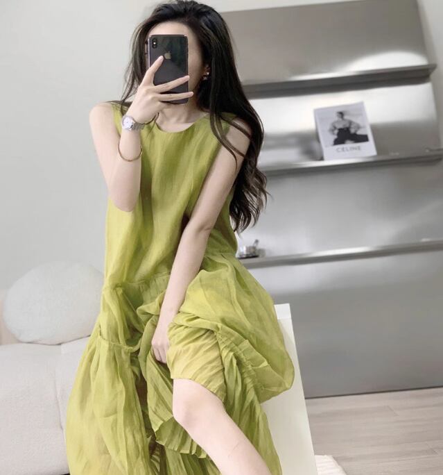 レディース スカート ワンピース プルオーバー ドレス ロングスカート ロング 丈長 袖なし ノースリーブ ラウンドネック ワイド フレア Aライン 裾ワイド フェミニン レース シフォン フリル 透け感 シースルー 薄手 かわいい 大人可愛い きれいめ シンプル カジュアル 上品 おしゃれ レトロ アジアン こなれ感 ラフ ルーズ 個性的 エレガント モダン 主役級 存在感 とろみ感 抜け感 ラブリー ナチュラル 無地 夏 リゾート ビーチ 休日 バカンス 楽ちん 体型カバー S M L XL グリーン