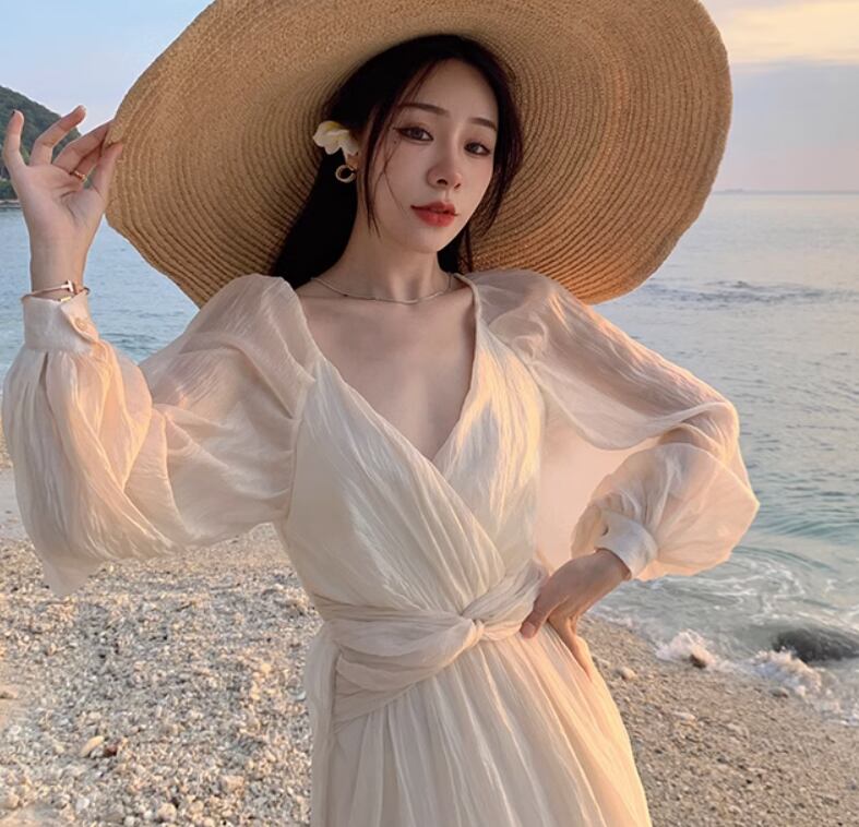 レディース スカート ワンピース フレア フレアスカート ロングスカート ミモレ ロング 長袖 ボリューム袖 パフスリーブ Vネック 襟なし Aライン 裾ワイド フェミニン シフォン ウエストマーク 透け感 シースルー 異国風 薄手 かわいい 大人可愛い きれいめ シンプル 上品 おしゃれ レトロ アジアン こなれ感 ラフ 個性的 エレガント モダン 主役級 存在感 とろみ感 抜け感 ラブリー ラグジュアリー ロマンティック 無地 春 夏 リゾート ビーチ バカンス 清楚 S M L XL アプリコット