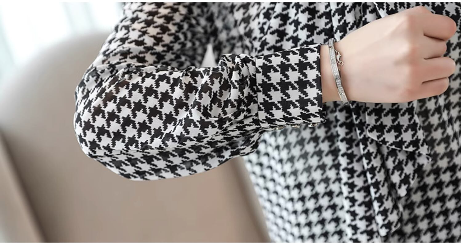 リボンがついた女性らしいデザインのシャツブラウスです。シフォン素材が優雅な印象を与えます。オフィスやデートなど、様々なシーンで活躍してくれる万能アイテムです。カジュアルにも上品にも着こなせるので、一枚あると便利です。千鳥格子の柄がトレンド感を演出し、さりげなくおしゃれな印象を与えます。さらっとした素材感で、着心地も抜群です。