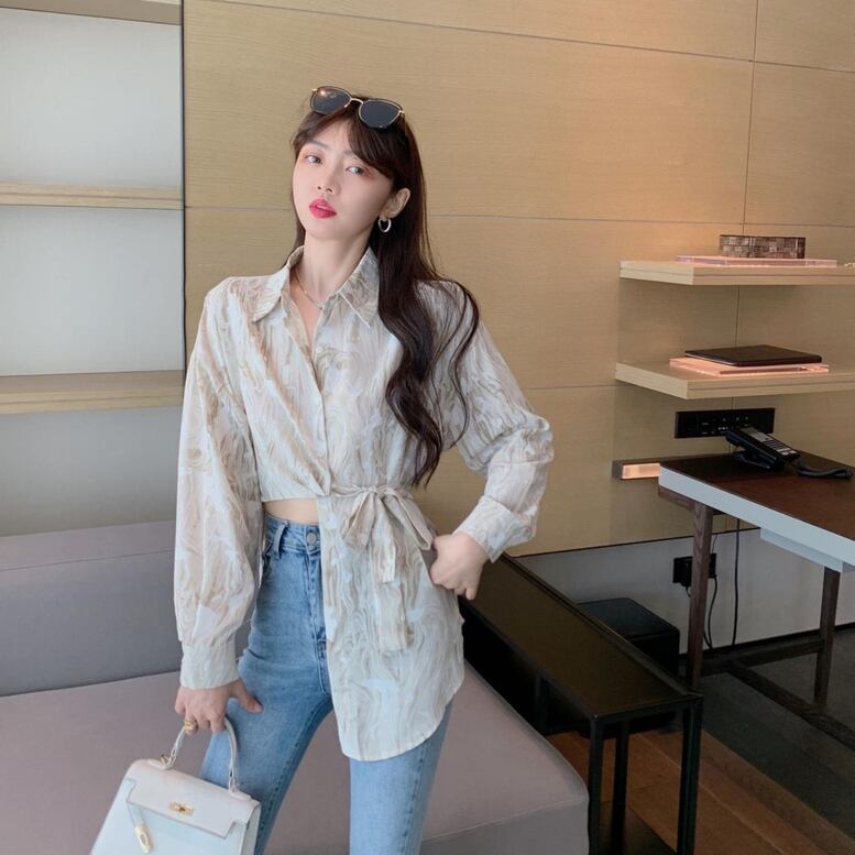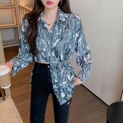 シャープで洗練されたアシンメトリー総柄シャツが登場しました!トレンド感溢れるデザインでありながら、シンプルながらも上品な印象を与えます。長袖、襟付きのデザインで、オフィスやデイリーなシーンにもマッチします。