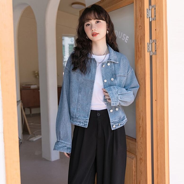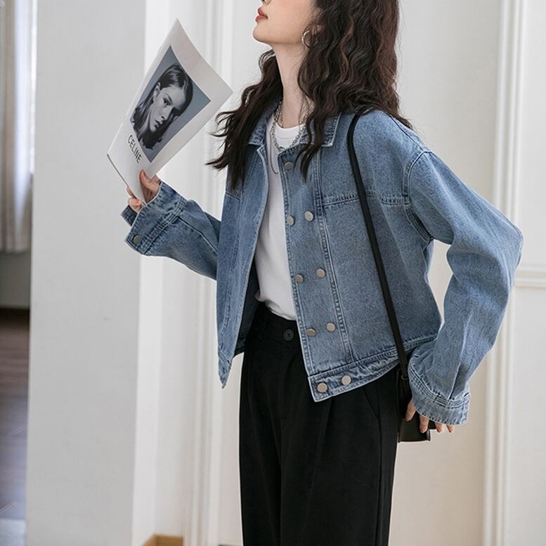 爽やかさと女性らしい抜け感を兼ね備えたダブルボタンデニムジャケット。シンプルなデザインながらも、ダブルボタンのディテールがアクセントになり、おしゃれでキレイめな印象を演出します。ライトアウターとしてはもちろん、羽織りとしても活躍するオールマイティーな一枚です。