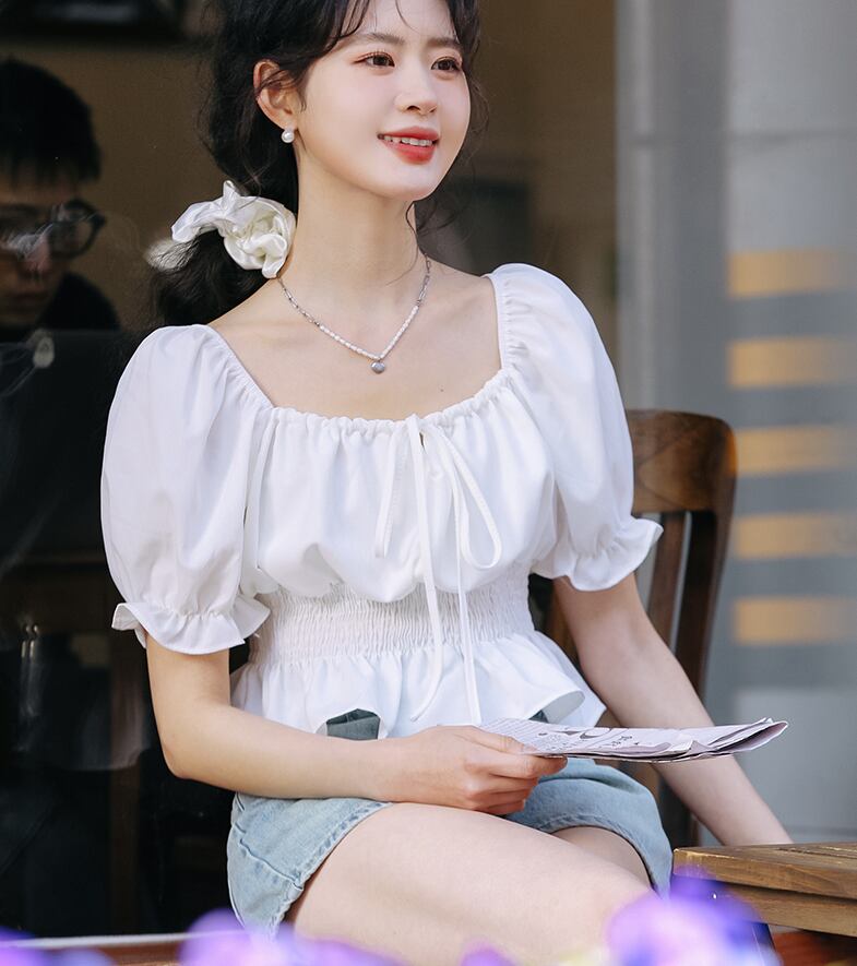 きれいなシルエットが魅力のシャツトップス。パフスリーブと袖口のフリルが女性らしさを引き立て、スクエアネックとウエストシャーリングが華奢な印象を与えます。リボンのアクセントがかわいらしさを演出し、大人可愛い雰囲気を醸し出します。シンプルなデザインなので、どんなスタイルにも合わせやすく、カジュアルから上品まで様々なコーディネートに対応しています。夏にぴったりな涼しい素材を使用しており、デートやお出かけ、休日などさまざまなシーンで活躍します。体型カバーも叶える設計で、清楚な印象を与えることができます。S、M、Lの3サイズ展開で、幅広い方にご利用いただけます。ホワイトの無地デザインは定番のおしゃれアイテムですので、ぜひお手元にお迎えしてください。