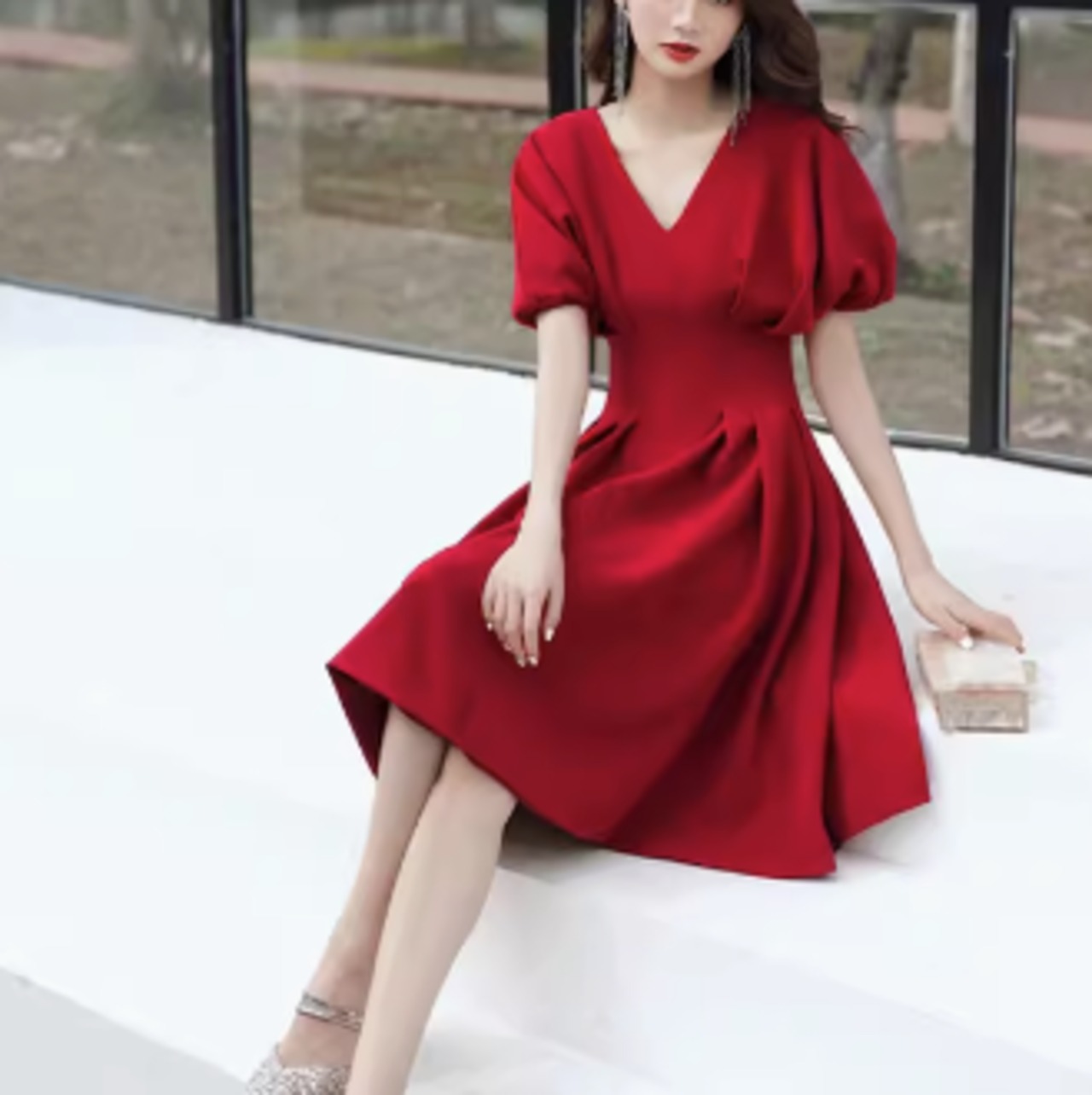 ボリューム袖のパフスリーブが可愛らしさを演出し、Vネックで女性らしい抜け感をプラス。ウエストマークや切り替えデザインなど、細部にまでこだわったデザインが特徴です。