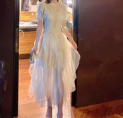 半袖の膝下丈のレディーススカートです。フレンチスリーブとラウンドネックのデザインで、上品でフェミニンな印象を与えます。ウエストにはウエストマークがあるため、スタイルアップ効果も期待できます。素材には薄手で透け感あるシフォン素材を使用しており、着心地も抜群です。きれいめからフォーマルシーンまで幅広く活躍してくれる一着です。