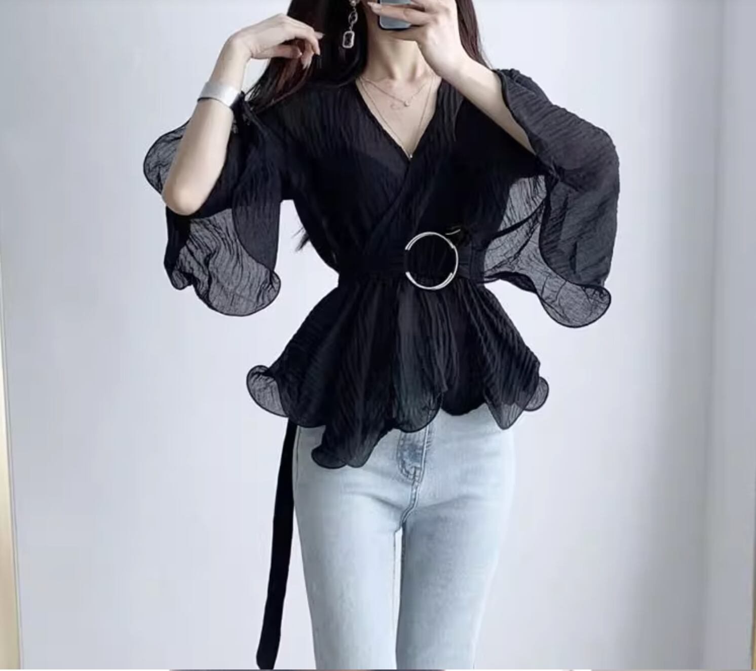 甘く華やかなデザインのフレアスリーブのトップスです。Vネックとカシュクールデザインが女性らしい印象を与え、ウエストマークのベルトでメリハリのあるシルエットを演出します。透け感のあるシアー素材やシワ加工のデザインが個性的な雰囲気を醸し出し、オシャレな大人の女性にぴったりです。