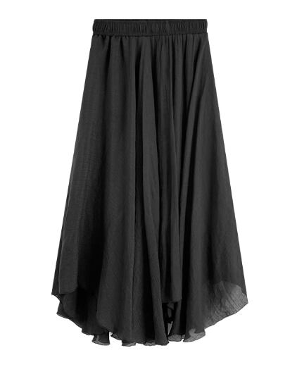 シックなカラーが大人可愛いロングスカート。スカートの裾が不規則になっていて動く度にふわりと揺れてとても綺麗です。薄手で涼しげなので暑い夏にもピッタリのアイテムです。シンプルなので着回し力抜群。