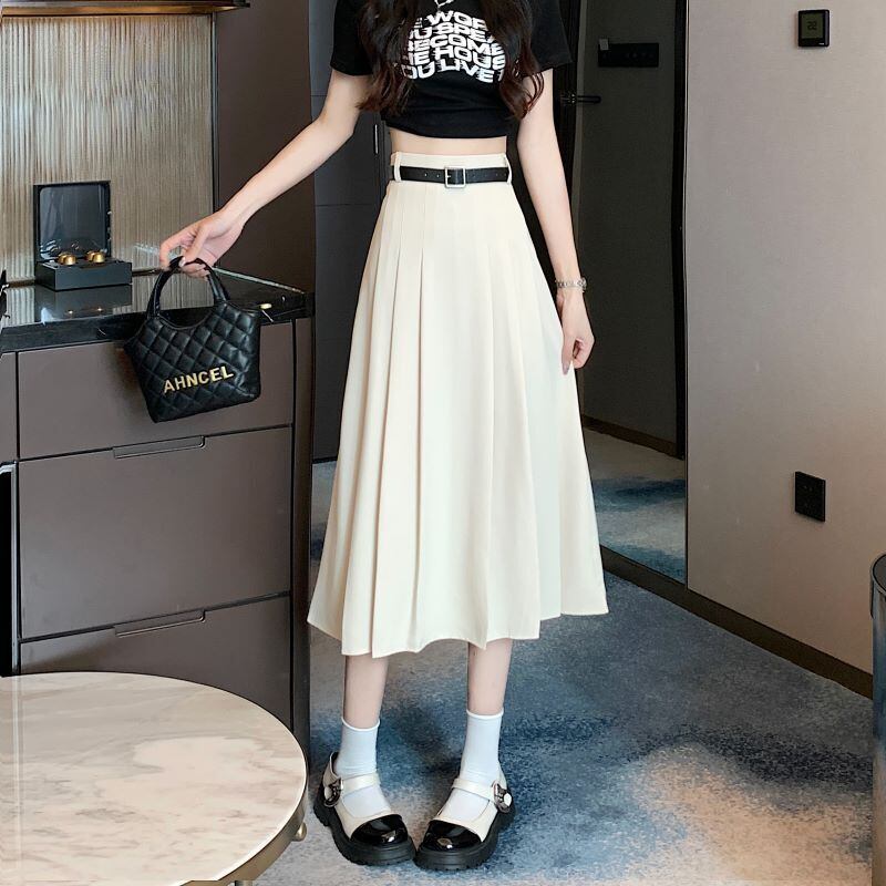 前面部分のみタックプリーツデザインのAラインスカート。後ろ面はプリーツのないすっきりシルエットの切り替えデザインで、すらりと足長に見えるハイウエストのミディアム~ミモレ丈です。後ろウエストにのみゴムが入っており、トップスの裾インコーデ時にもカジュアルに見えすぎずきれいめに決まるアイテムです。