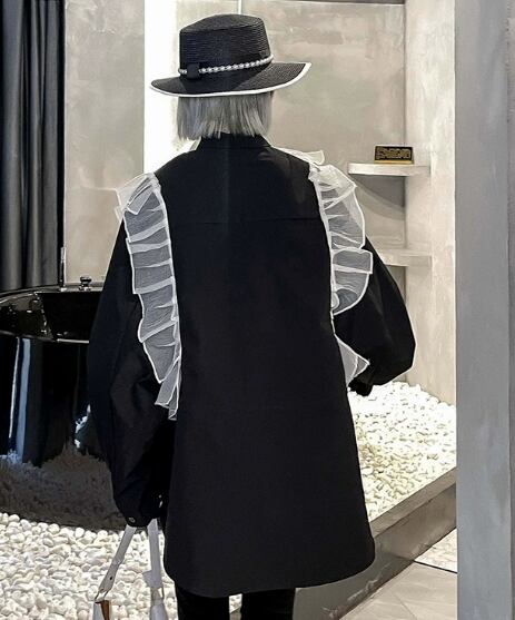 モード系のファッションが好きな方におすすめのスタイリッシュなブラックシャツ。真っ黒ではなくホワイトのチュール素材を部分的に使うことでインパクトのあるデザインになっています。シックなのに存在感抜群のアイテム。モノトーンコーデでクールに纏めるのが◎