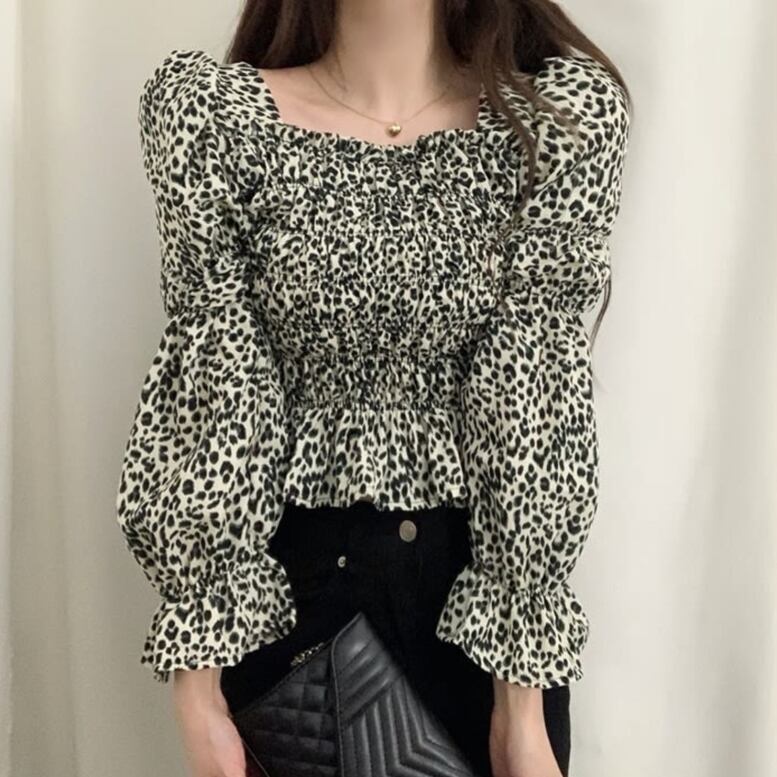 レオパード柄シャーリングブラウス レディース トップス プルオーバー シャツ アニマル柄 レオパード柄 ヒョウ柄 ブラウス シャーリング 長袖 スクエアネック パフスリーブ 袖口フリル 総柄 イエロー ホワイト オシャレ シンプル 可愛い キレイめ 上品 フェミニン シック ハンサム マニッシュ カジュアル デイリー おでかけ 普段着 スマート 細見え スタイルアップ 高見え 新鮮 主役級 鮮度アップ 上級者 ゆったり 体型カバー インスタ映え トレンド