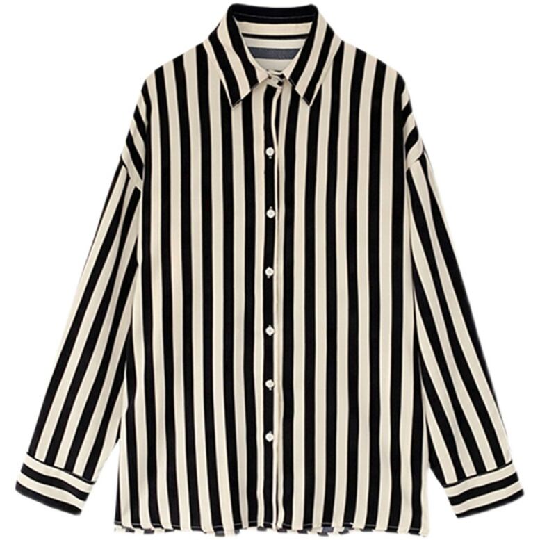 ストライプシャツ レディース トップス シャツ ストライプ柄 長袖 襟付き シフォンシャツ ドロップショルダー ブラウス 長袖シャツ とろみシャツ ブラック ホワイト シンプル きちんと感 可愛い キレイめ 上品 フェミニン シック 知的 ハンサム マニッシュ カジュアル デイリー おでかけ 仕事 オンオフ兼用 普段着 王道 万能 機能性 スマート 細見え スタイルアップ 高見え 新鮮 主役級 鮮度アップ 上級者 軽やか ゆったり 体型カバー