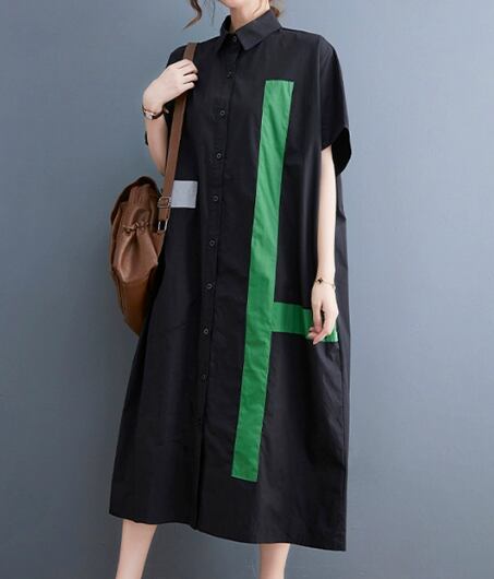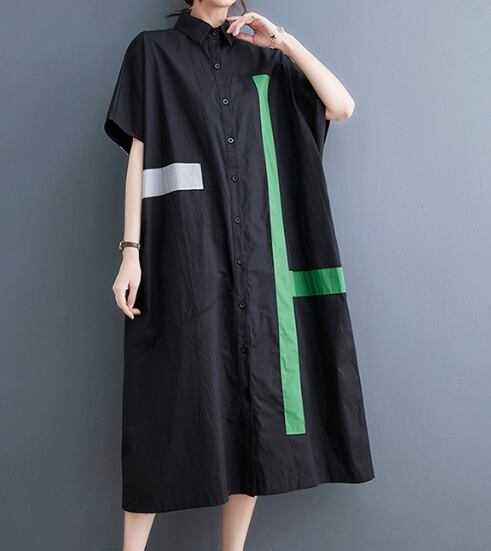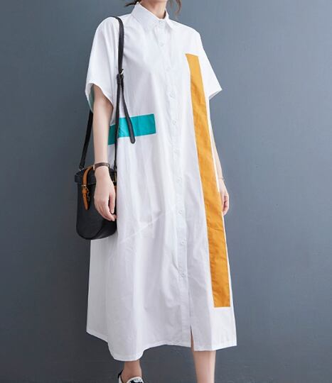 ところどころ不規則に色が違くなっている個性的なデザインがスタイリッシュな半袖のシャツワンピース。遠くから見ても一目で存在を主張できるほどインパクトのある一枚です。ワイドな作りになっているので暑い夏にぴったりのアイテムです。