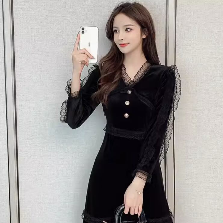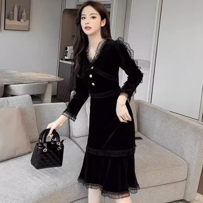 女性らしさが光る黒ベルベット長袖ドレス