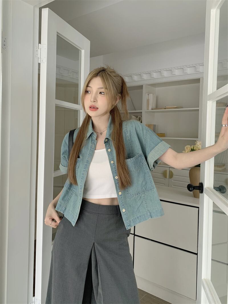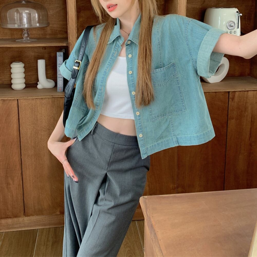 レディース トップス シャツ デニムシャツ 半袖 襟付き 角襟 ワイド 前開き ボタン アメカジ デニム かわいい 大人可愛い シンプル カジュアル おしゃれ こなれ感 ラフ 個性的 エレガント モダン 抜け感 ヴィンテージ キュート ベーシック アメリカン アクティブ 大人っぽい 大人女子 お洒落 爽やか 無地 春 夏 重ね着 韓国 オルチャン 楽ちん 体型カバー 脚長 普段使い 着回し レイヤード デイリー スタイルアップ 動きやすい S M L ゆったり ゆる 水色 くすみ ライトブルー