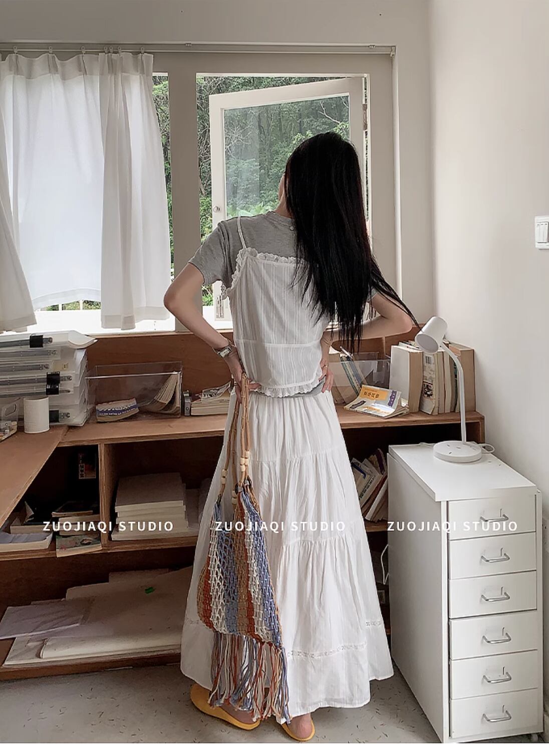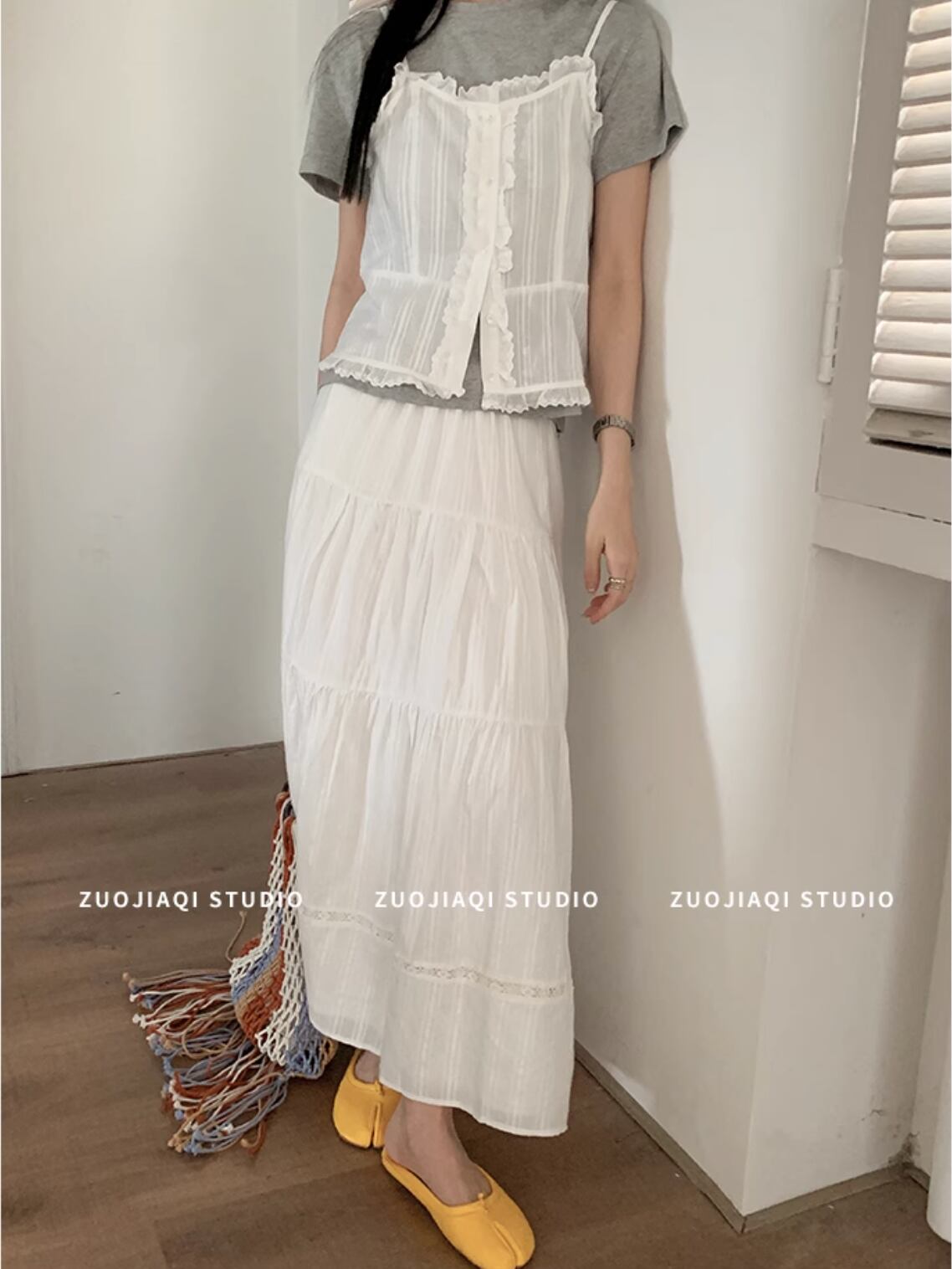 スカートとキャミソールのセットアップです。キャミソールは涼しげで通気性があり、スカートはジャガード織りが細部まで美しく上品な印象を与えます。ホワイトのカラーは清楚で爽やかな印象を与え、さまざまなコーディネートにマッチします。レイヤードスタイルでいろいろなコーディネートも楽しめます。