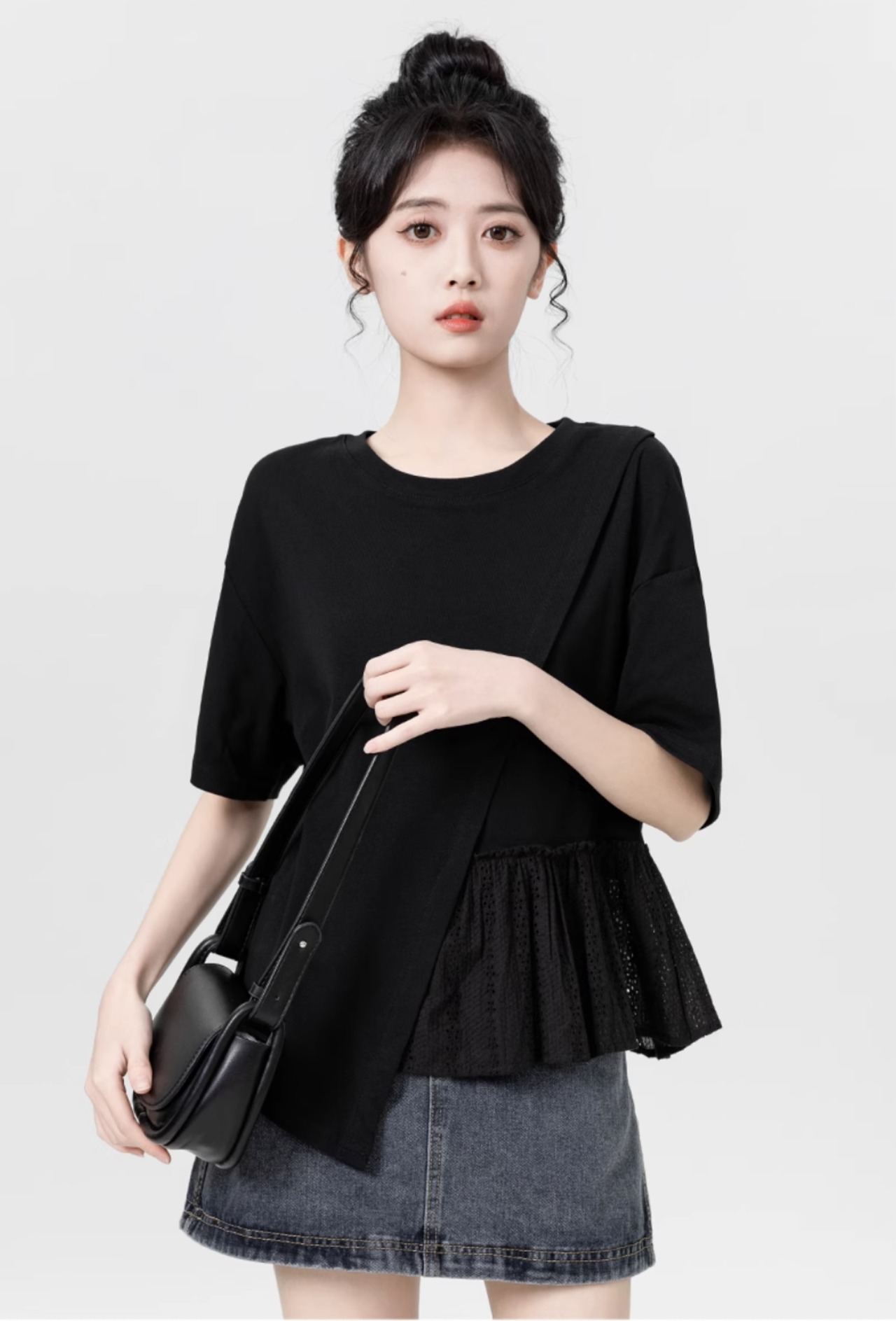 レディース トップス プルオーバー Tシャツ ショート 半袖 フェミニン アシンメトリー フリル 刺繍 アイレットレース かわいい 大人可愛い きれいめ シンプル カジュアル 上品 おしゃれ レトロ ラフ ガーリー ルーズ ナチュラル 無地 夏 秋 オフィス ビジネス OL 通勤 デート お出かけ お泊まり アウトドア キャンプ イベント リゾート 旅行 海 プール ビーチ 女子会 休日 バカンス ライブ フェス 重ね着 韓国 コーデ 体型カバー 普段使い 着回し レイヤード 清楚 S L ブラック