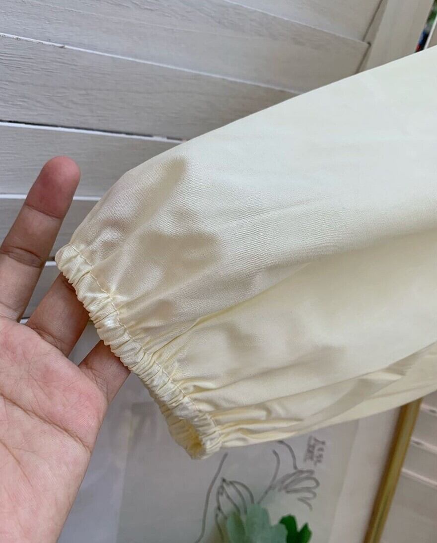 アンバランスなヘムデザインがおしゃれなクエーカーカラーのオーバーサイズブラウス。大きめの襟やパフスリーブが大人可愛く、胸上のシャーリングギャザーがポイントです。身幅かなりゆったりめのビックシルエットデザインで、体型カバーにも最適。