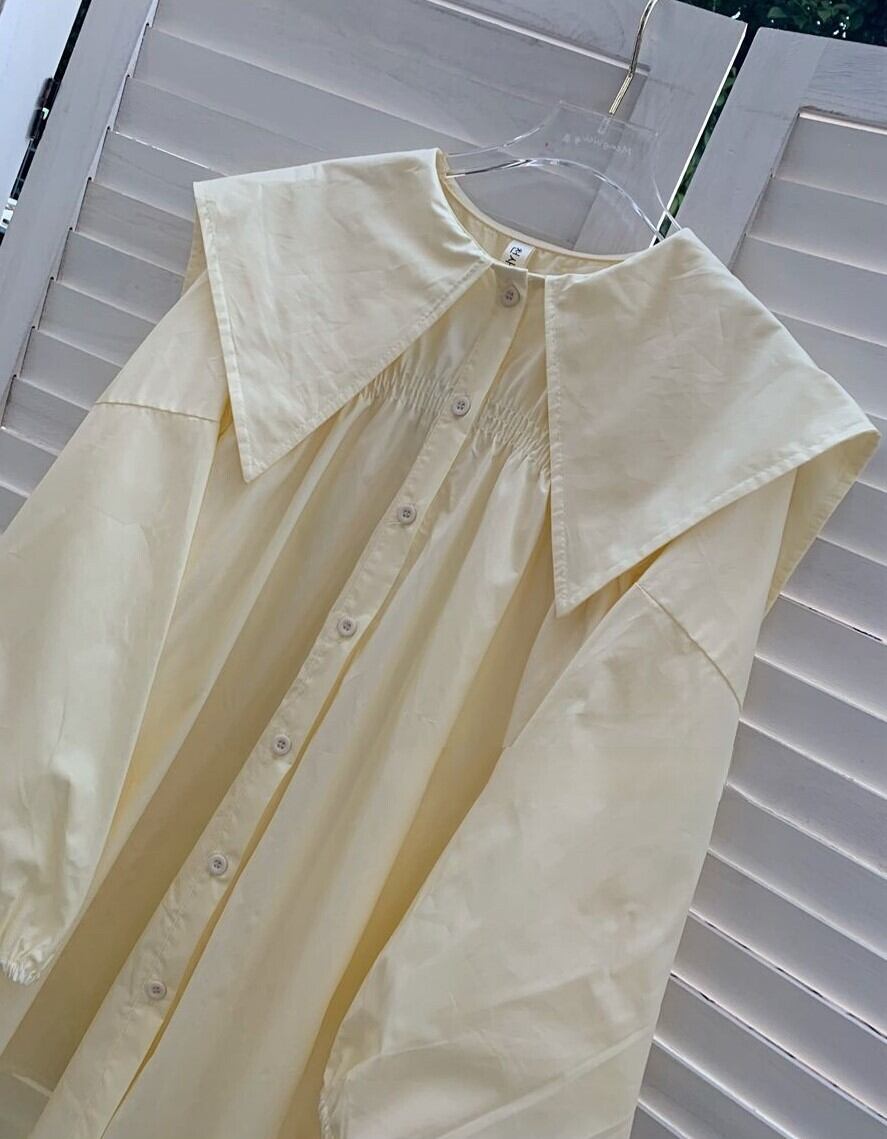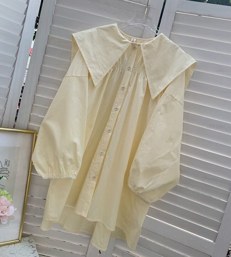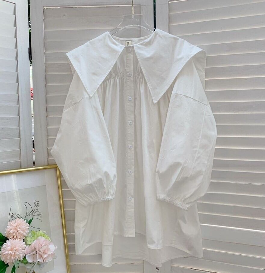オーバーサイズ ビックシルエット クエーカーカラー アンバランスヘム レディース トップス ブラウス ミディアム丈 チュニック丈 長袖 ボリューム袖 パフスリーブ ドロップショルダー 襟付き ビックカラー 大きめ衿 前開き 胸上シャーリングギャザー かわいい 大人可愛い きれいめ シンプル カジュアル 上品 おしゃれ こなれ感 キュート フェミニン 無地 春 秋 女の子 学生 学校 通学 デート お出かけ 休日 重ね着 体型カバー 普段使い 着回し 清楚 ゆる フリーサイズ ホワイト クリーム