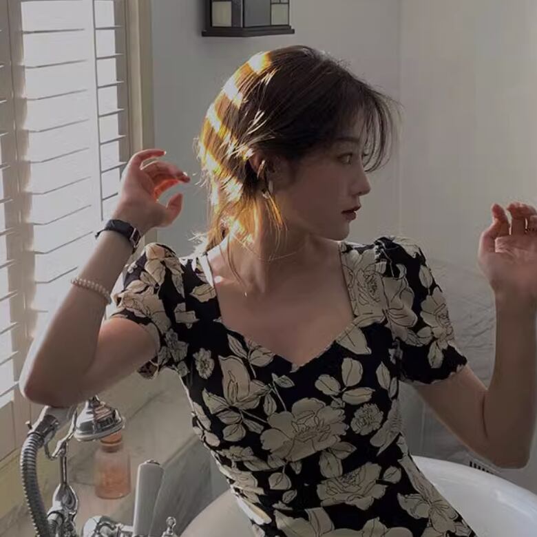 女性らしいシルエットと花柄が大人可愛いデザインです